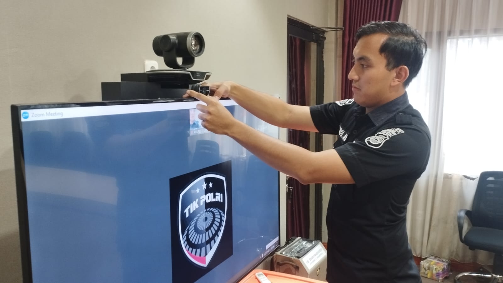 Anggota Tik Polres Cilegon Menyiapkan Sarana dan Prasarana Untuk Kegiatan Zoom meeting Dalam pelaksanaan kegiatan zoom meeting tersebut anggota TIK Polres Cilegon yang bertanggung jawab untuk menyiapkan peralatan zoom. Selain itu agar di tidak ada gangguan jaringan sebelum pelaksanaan anggota TIK melakukan pemeriksaan terhadap sarana dan prasarana tersebut . Satu jam sebelum kegiatan zoom meeting itu dimulai. Kapolres Cilegon AKBP. DR. MARTUA RAJA TARIPAR LAUT SILITONGA. melalui Kasi TIK IPTU Lukman menyampaikan bahwa “untuk menunjang kelancaran penyampaian informasi anggota TIk Polres Cilegon selalu memeriksa sarana dan prasarana tersebut, sebelum maupun pada saat pelaksanaan akan selalu di monitor”
