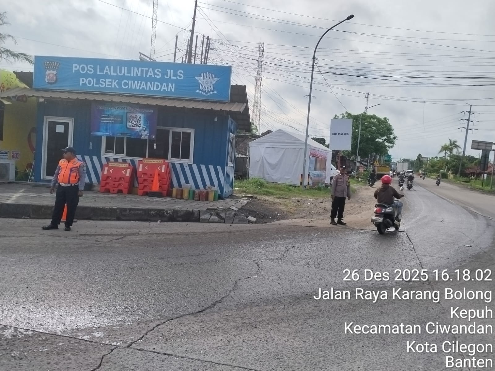 Cilegon - Guna Menciptakan kelancaran arus Mudik Natal tahun 2025 Dan Tahun Baru 2026 yang menuju Pelabuhan Pelindo Dan jalur wisata yang ada di daerah hukum Polsek Ciwandan Polres Cilegon Polda Banten,Pospam 5 Ciwandan berlakukan rekayasa Lalu lintas, Jum'at (26/12/2025).