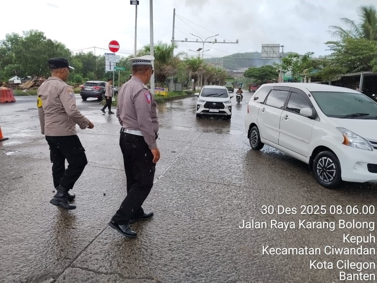 Cilegon - Personil Pos Pam 5 Polsek Ciwandan Polres Cilegon Polda Banten melaksanakan kegiatan pengaturan lalu-lintas dalam pengamanan Libur Natal 2025 Dan Tahun Baru 2026. Selasa (30/12/2025).