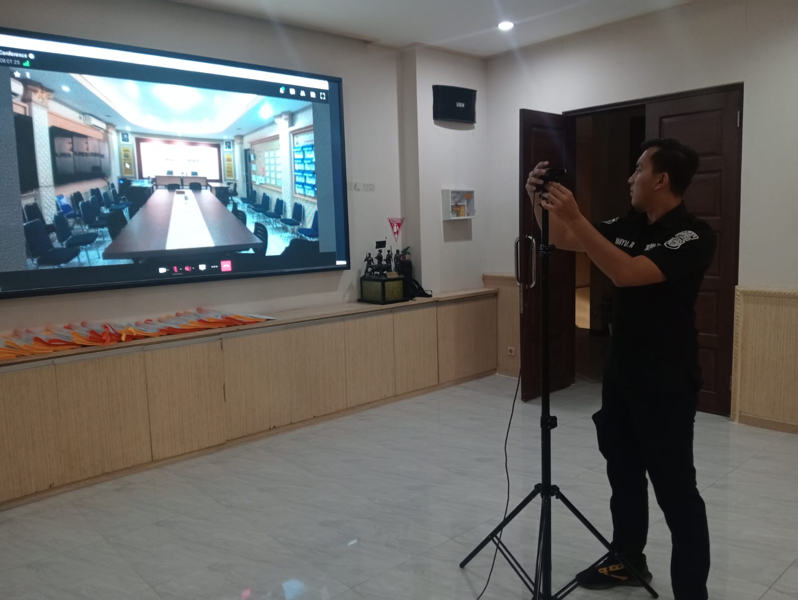 Anggota Tik Polres Cilegon Menyiapkan Sarana dan Prasarana Untuk Kegiatan Zoom meeting Dalam pelaksanaan kegiatan zoom meeting tersebut anggota TIK Polres Cilegon yang bertanggung jawab untuk menyiapkan peralatan zoom. Selain itu agar di tidak ada gangguan jaringan sebelum pelaksanaan anggota TIK melakukan pemeriksaan terhadap sarana dan prasarana tersebut . Satu jam sebelum kegiatan zoom meeting itu dimulai. Kapolres Cilegon AKBP. DR. MARTUA RAJA TARIPAR LAUT SILITONGA. melalui Kasi TIK AIPTU Suwanto, S.H. menyampaikan bahwa “untuk menunjang kelancaran penyampaian informasi anggota TIk Polres Cilegon selalu memeriksa sarana dan prasarana tersebut, sebelum maupun pada saat pelaksanaan akan selalu di monitor”