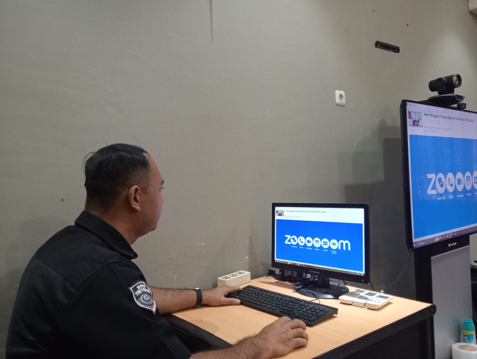 Anggota Tik Polres Cilegon Menyiapkan Sarana dan Prasarana Untuk Kegiatan Zoom meeting Dalam pelaksanaan kegiatan zoom meeting tersebut anggota TIK Polres Cilegon yang bertanggung jawab untuk menyiapkan peralatan zoom. Selain itu agar di tidak ada gangguan jaringan sebelum pelaksanaan anggota TIK melakukan pemeriksaan terhadap sarana dan prasarana tersebut . Satu jam sebelum kegiatan zoom meeting itu dimulai. Kapolres Cilegon AKBP. DR. MARTUA RAJA TARIPAR LAUT SILITONGA. melalui Kasi TIK AIPTU Suwanto, S.H. menyampaikan bahwa “untuk menunjang kelancaran penyampaian informasi anggota TIk Polres Cilegon selalu memeriksa sarana dan prasarana tersebut, sebelum maupun pada saat pelaksanaan akan selalu di monitor”
