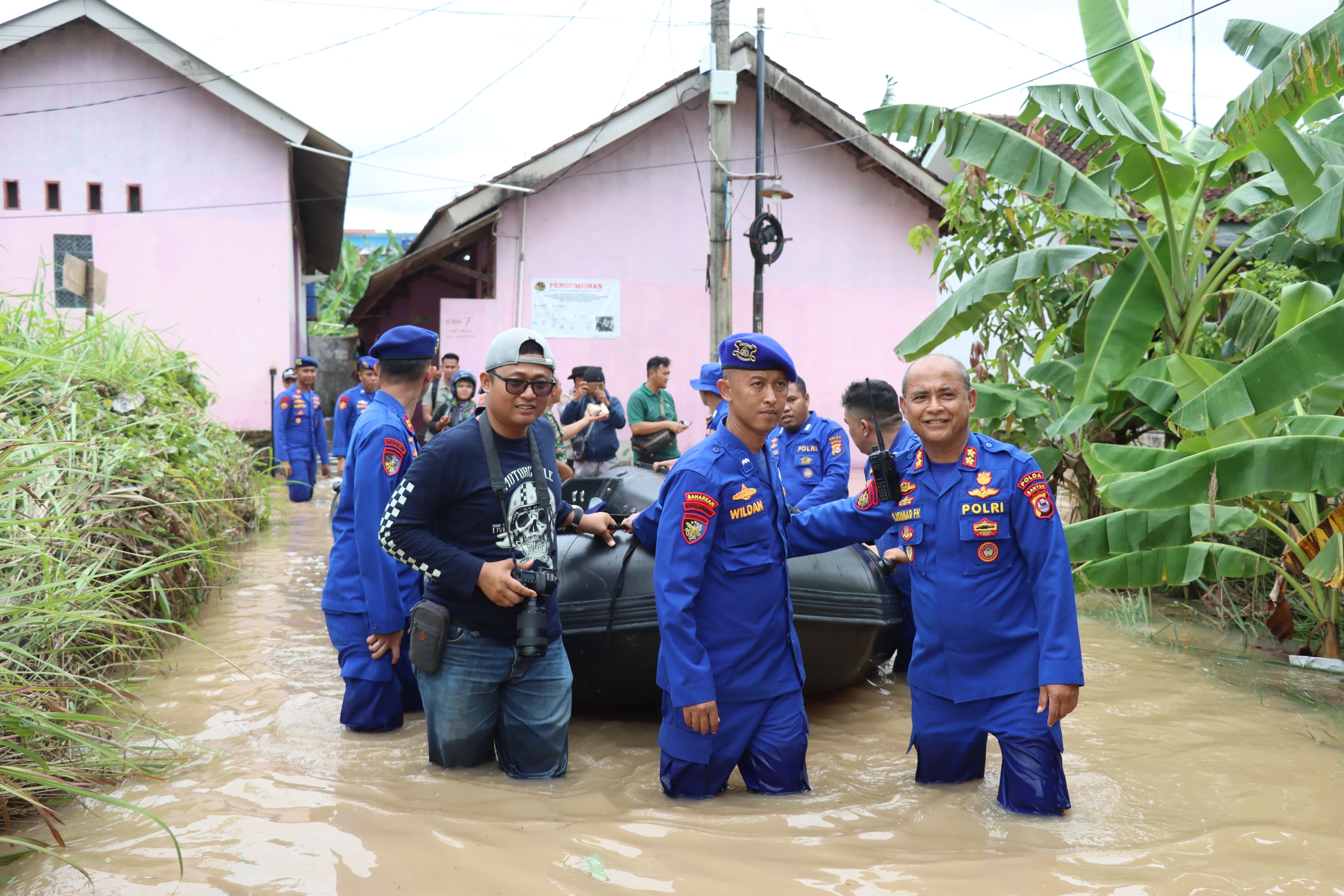 Usai meninjau dapur umum, Kapolda Banten melanjutkan pengecekan ke lokasi banjir di Lingkungan Sambirata RT 005/003, Kelurahan Cibeber, Kecamatan Cibeber. Di lokasi tersebut, Kapolda melihat langsung kondisi pemukiman warga yang terdampak banjir sekaligus menyerahkan bantuan makanan kepada masyarakat sebagai bentuk empati dan dukungan moril.