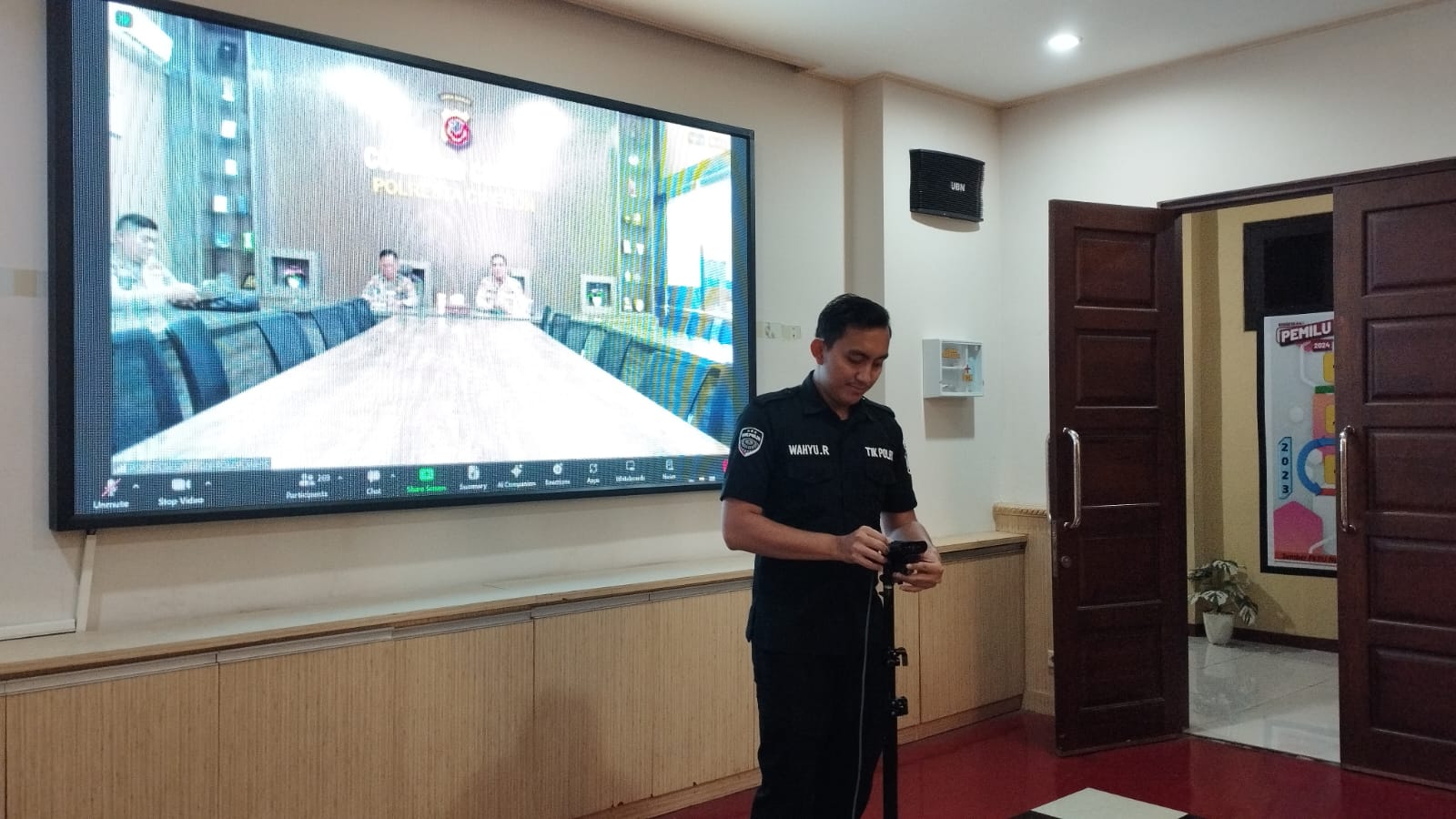 Anggota Tik Polres Cilegon Menyiapkan Sarana dan Prasarana Untuk Kegiatan Zoom meeting Dalam pelaksanaan kegiatan zoom meeting tersebut anggota TIK Polres Cilegon yang bertanggung jawab untuk menyiapkan peralatan zoom. Selain itu agar di tidak ada gangguan jaringan sebelum pelaksanaan anggota TIK melakukan pemeriksaan terhadap sarana dan prasarana tersebut . Satu jam sebelum kegiatan zoom meeting itu dimulai. Kapolres Cilegon AKBP. DR. MARTUA RAJA TARIPAR LAUT SILITONGA. melalui Kasi TIK AIPTU Suwanto, S.H. menyampaikan bahwa “untuk menunjang kelancaran penyampaian informasi anggota TIk Polres Cilegon selalu memeriksa sarana dan prasarana tersebut, sebelum maupun pada saat pelaksanaan akan selalu di monitor”