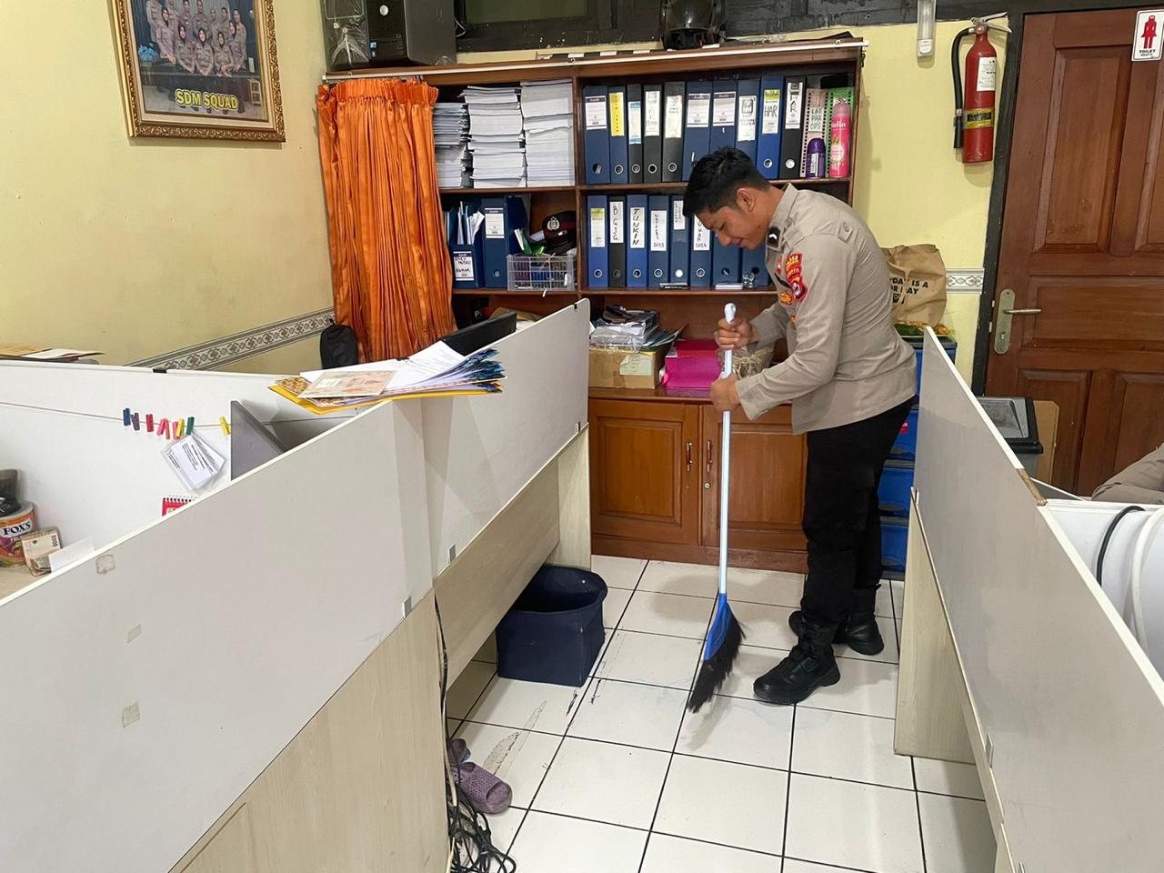 Anggota Bag SDM Polres Cilegon, mmelaksankan kegiatan membersihkan ruangan kerja secara rutin.
