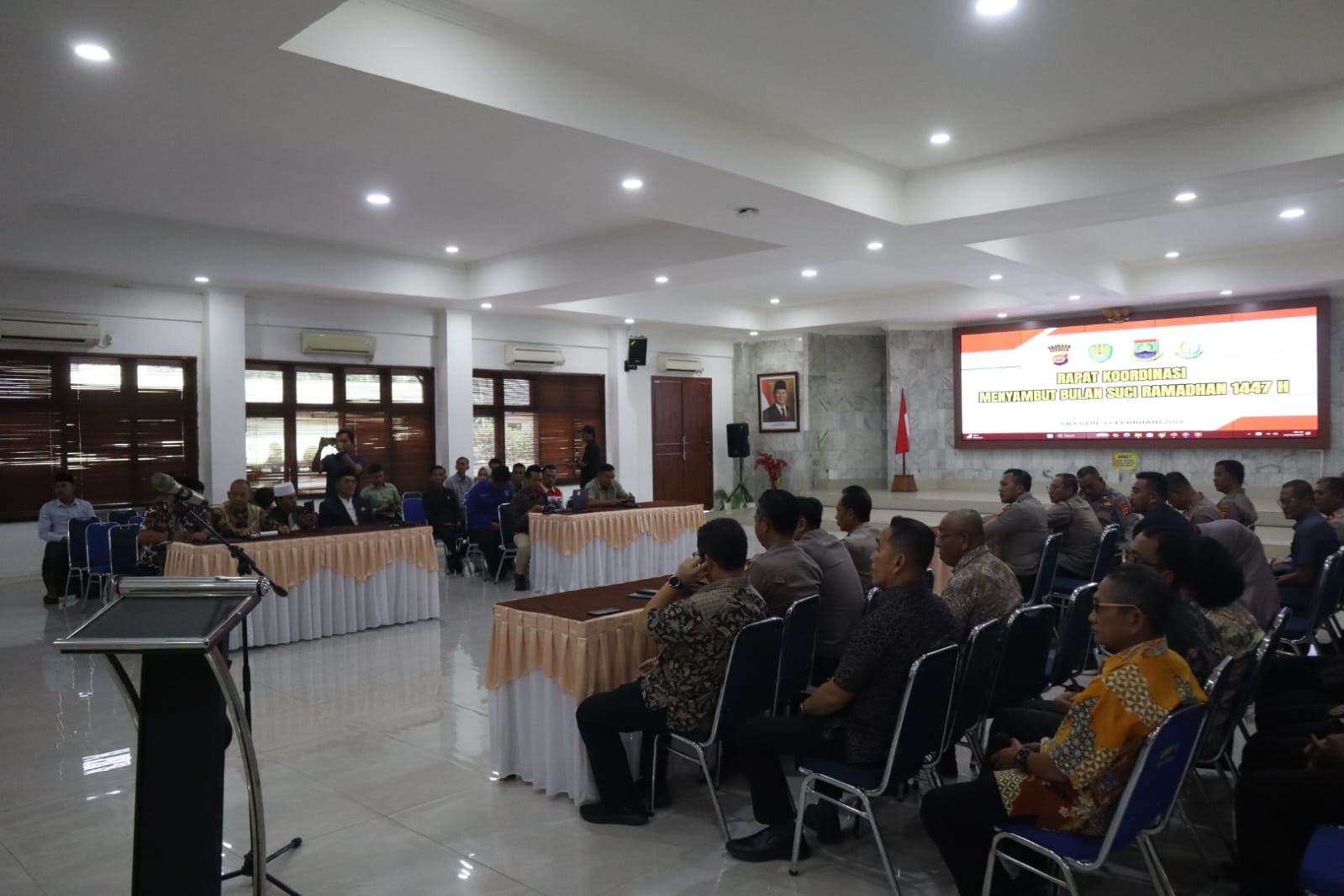 Rapat koordinasi dilaksanakan di bawah penanggung jawab Kapolres Cilegon AKBP Dr. Martua Raja Taripar Laut Silitonga, S.H., S.I.K., M.Si. Kegiatan turut dihadiri Wakapolres Cilegon KOMPOL M. Ridzky Salatun, S.I.K., Wakil Ketua I DPRD Kota Cilegon H. Sohidin, S.H., Wakil Ketua II DPRD Kota Cilegon H. Masduki, Asda II Kota Cilegon H. Dana Sujaksani, S.Sos., M.Si., Danramil Cilegon Mayor Inf Usman, Plt Kadis Ketahanan Pangan Kota Cilegon Novi Yogi, Sekjen MUI Kota Cilegon H. Sutisna Abas, Ketua MUI Kabupaten Serang H. Muhit, Ketua FKUB Kabupaten Serang KH. Komarudin, Head Operation ASDP Merak I Putu Widhiyatamaja, Jr Officer Sc PT Pertamina Tanjung Gerem Achtizen, para PJU Polres Cilegon, Kapolsek jajaran Polres Cilegon, perwakilan SKPD Kota Cilegon, pimpinan instansi terkait, serta pimpinan organisasi keagamaan.