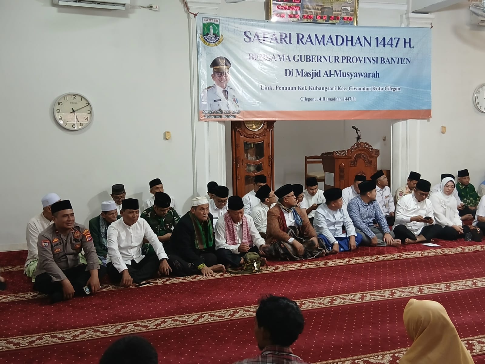 Cilegon - Bhabinkamtibmas Polsek Ciwandan Polres Cilegon Polda Banten AIPDA Asep Karyudin hadir dan mengamankan kegiatan Safari Ramadhan tingkat Provinsi Banten yang dilaksanakan di Masjid Al-Musyawarah, Jl. Sunan Bonang, Kelurahan Kubangsari, Kecanatan Ciwandan, Kota Cilegon, Kamis (05/03/2026).