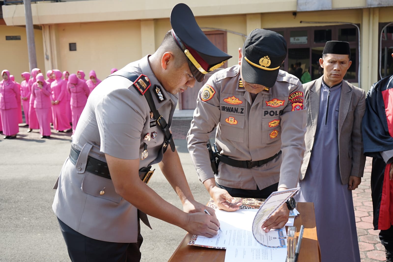 Cilegon - Kapolres Cilegon AKBP Dr. Martua Raja Taripar Laut Silitonga S.H S.IK M.S.I, memimpin langsung upacara pengangkatan dan serah terima jabatan (sertijab) tiga kapolsek di jajaran Polres Cilegon Polda Banten, kapolsek Kp Banten,Kapolsek Bojonegara dan Kapolsek Puloampel, selasa ,14/4/26