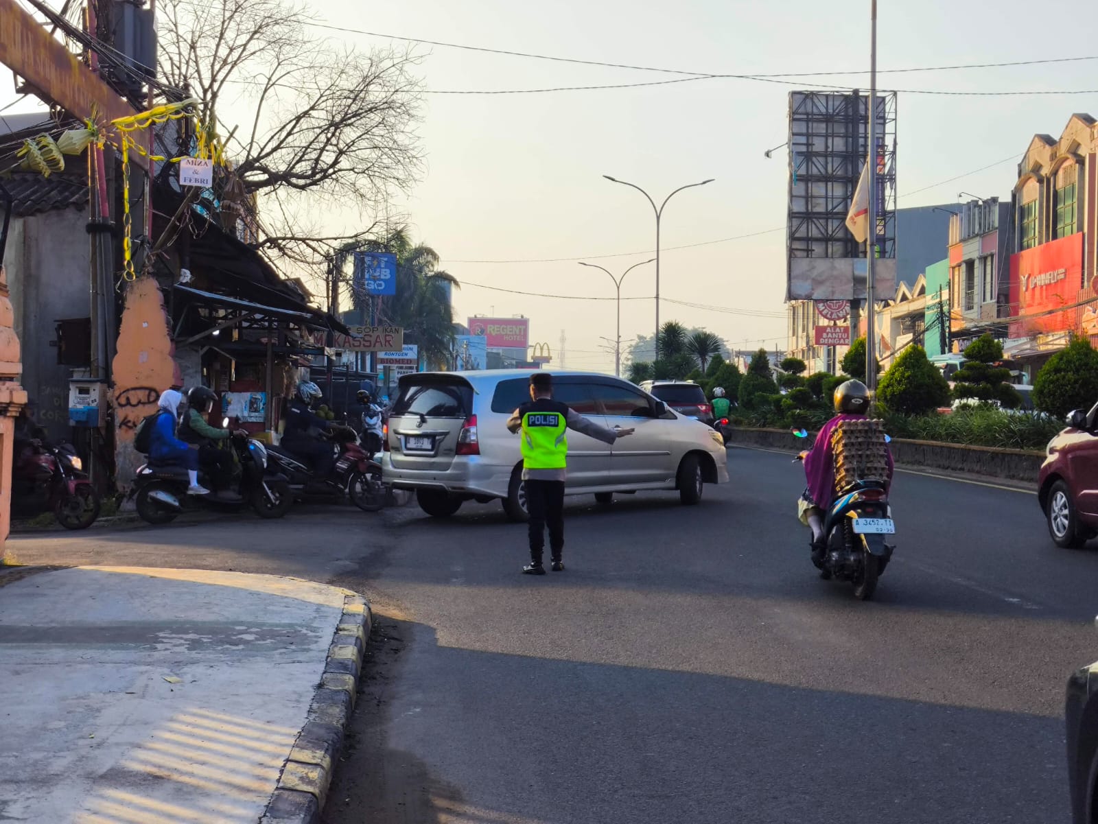Personil Siwas Polres Cilegon Melaksanakan Kegiatan Rutin pengaturan Arus Lalu Lintas di Jalur Protokol jalan Utama Kota Cilegon.