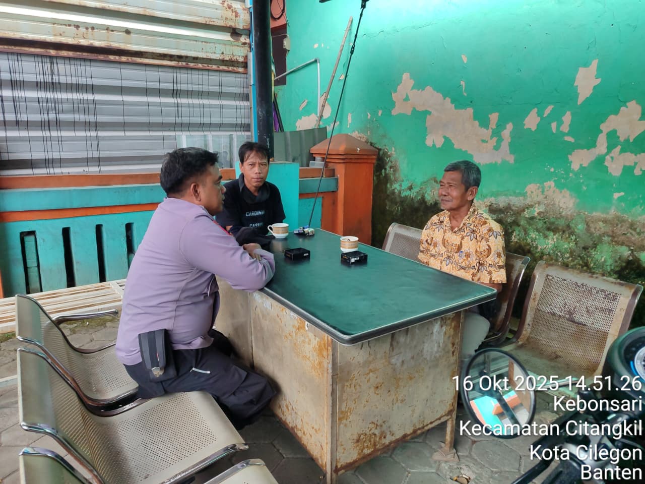 Cilegon - Personil Bhabinkamtibmas Polsek Ciwandan Polres Cilegon Polda Banten Menyampaikan Pesan Kamtibmas dan mengajak masyarakat terus aktif dalam kepedulian terhadap Pemeliharaan keamanan lingkungan di daerah Binaanya, Kamis (16/10/2025).