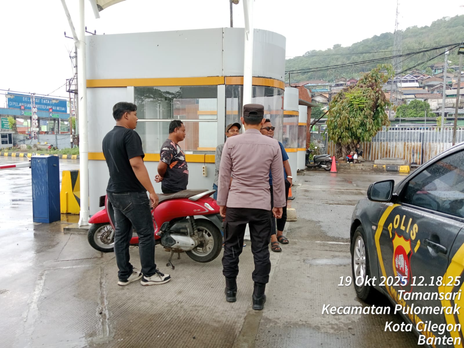 Cilegon - Personel Polsek Kskp Merak Polres Cilegon Polda Banten melaksanakan sambang dan patroli kawasan pelabuhan merak dalam rangka menjaga Harkamtibmas di Kawasan Pelabuhan Merak, Minggu (19/10/2025).
