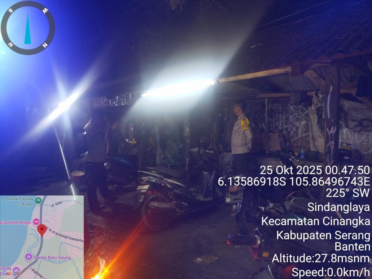 *Cilegon* – Dalam Rangka Pencegahan Kejahatan Jalanan dan Memelihara situasi keamanan dan menjaga serta memberikan rasa aman dan nyaman di masyarakat,Salah satu upaya untuk mewujudkan hal tersebut sebagaimana yang dilakukan oleh Personil Polsek Cinangka Polres Cilegon Polda Banten melaksanakan giat patroli blue light malam hari hingga menjelang pagi, Sabtu (25/10/2025).