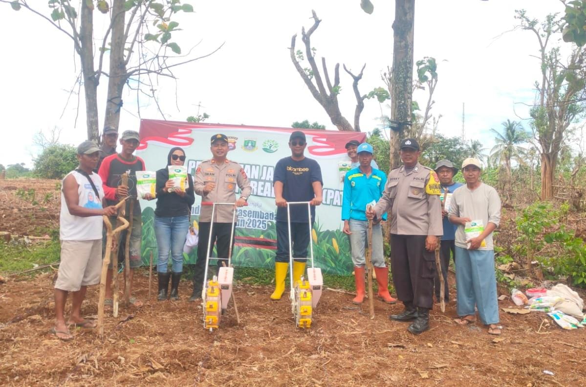 Kapolres Cilegon AKBP AKBP Dr. Martua Raja Taripar Laut Silitonga Melalui Kapolsek Anyar Polres Cilegon IPTU Iwan Sofiyan di Kp. Cikoneng Desa Cikoneng Kecamatan Anyar Kab Serang Dilaksanakan dan mengikuti Kegiatan Penanaman Jagung yang dilaksanakan Oleh Desa Cikoneng Pada perluasan Area Tanam dalam Rangka Mendukung Swasembada Pangan 2025 Serta Implementasi Program Prioritas Asta Cinta Presiden Republik Indonesia