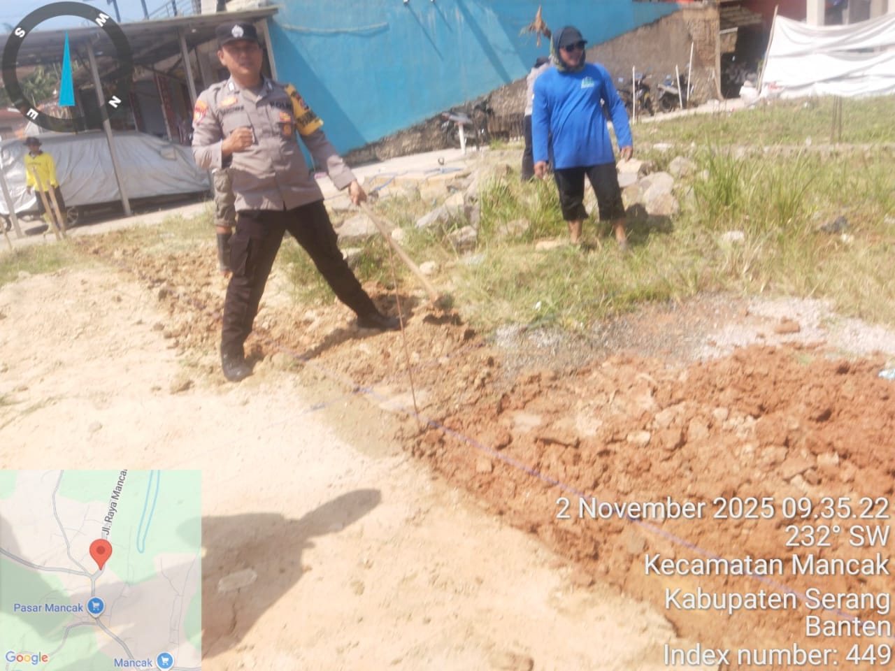 Bhabinkamtibmas Polsek Mancak Polres Cilegon Melaksanakan Kegiatan Sambang dan Melaksanakan giat gotong royong bersama kepala desa dan staf desa mancak._ Polres Cilegon.*_