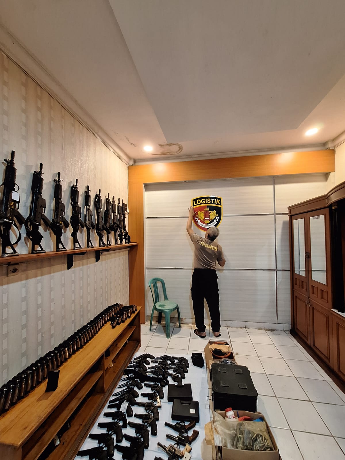 ANGGOTTA STAFF LOGISTIK MEMBERSIHKAN SENJATA DAN PENGECEKAN SENJATA API DI GUDANG
