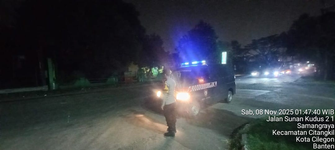 Cilegon - Personil Polsek Ciwandan Polres Cilegon Polda Banten Dalam Pelaksanaan Kegiatan Patroli dengan menyalakan lampu rotator berwarna biru di Daerah Hukum Polsek Ciwandan Polres Cilegon Polda Banten dari malam hingga dini hari, dalam rangka menciptakan situasi aman dan kondusif, Sabtu (08/11/2025).