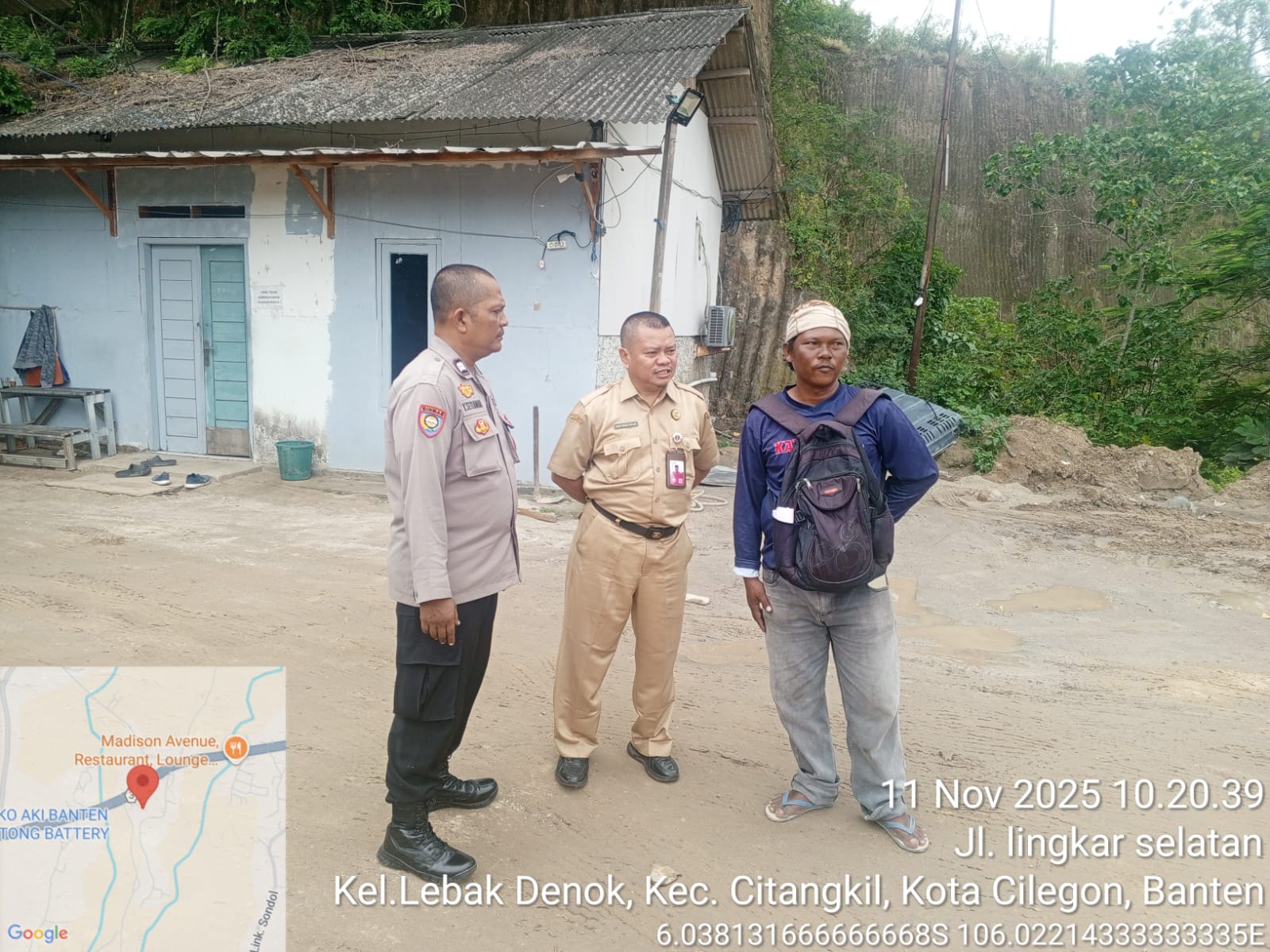 Cilegon - Panit Lantas Polsek Ciwandan IPTU Deni Mulyana dan Bhabinkamtibmas Kelurahan Tamanbaru AIPDA Ediyanto melaksanakan monitoring stokfile pasir di Lingkungan Kubang Lesung Pabuaran PT. Pamungkas Perkasa, Kelurahan Tamanbaru, Kecamatan Citangkil, Kota Cilegon, Selasa (11/11/2025).