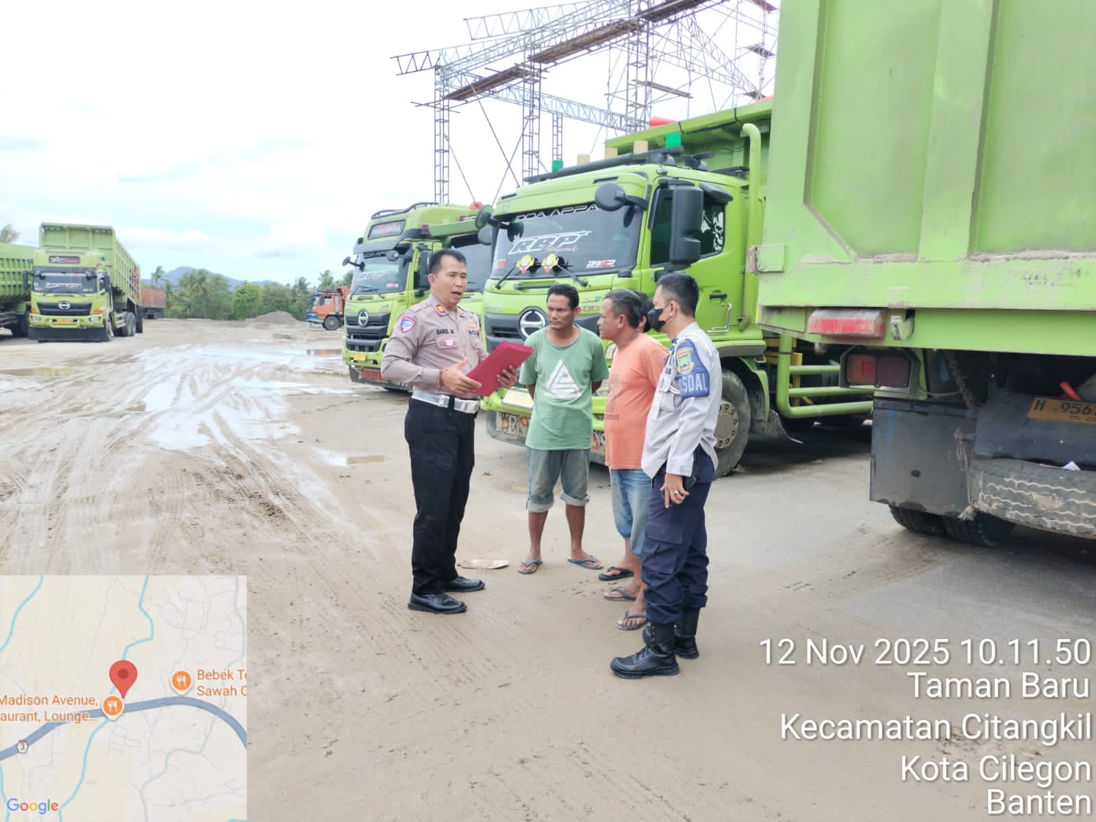Cilegon - Kanit Lantas Polsek Ciwandan AKP Haris Munandar melaksanakan Himbauan SK Gubernur Dan monitoring stokfile pasir Didaerah hukum Polsek Ciwandan, Rabu (12/11/2025).