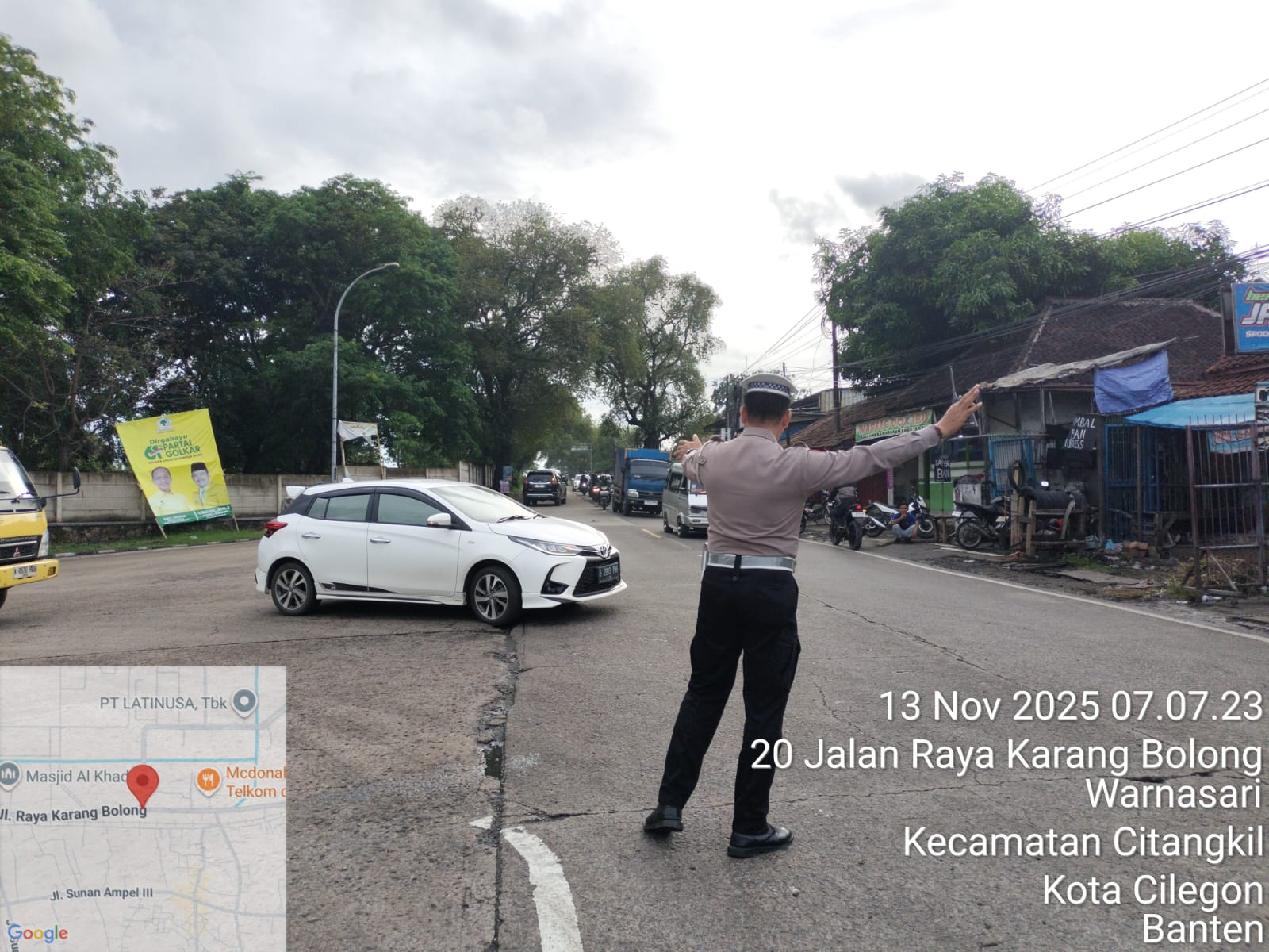 Cilegon - Guna Kelancaran Lalu-lintas Personil Unit Lantas Polsek Ciwandan Polres Cilegon Polda Banten melaksanakan pengaturan lalu-lintas di Simpang Beringin Ciwandan Pertigaan Kawasan Industri KSP/ KIEC I  kelurahan Warnasari Kecamatan Citangkil Kota Cilegon, Kamis (13/11/2025).