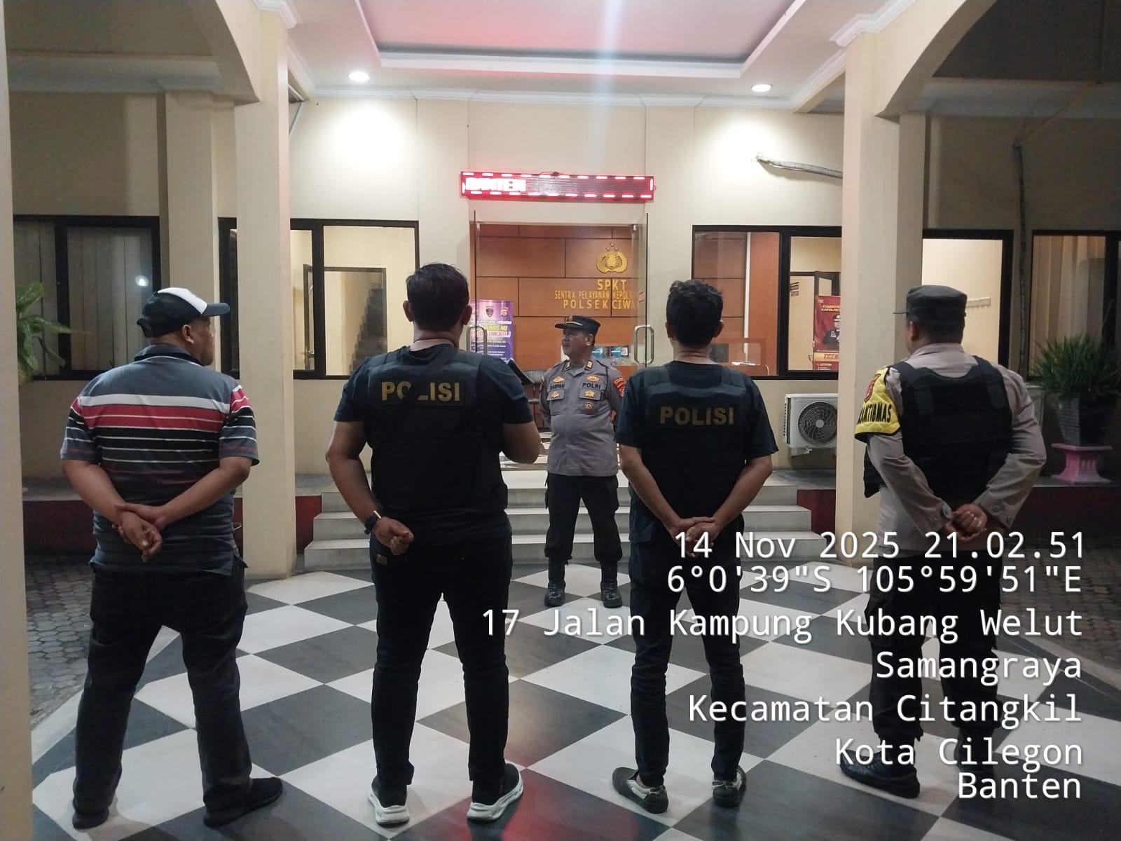 Cilegon - Personil Polsek Ciwandan Polres Cilegon Polda Banten menggelar apel malam Persiapan Patroli yang dipimpin Oleh Pawas Kanit Samapta Polsek Ciwandan AKP Sarpan, Minggu (16/11/2025).