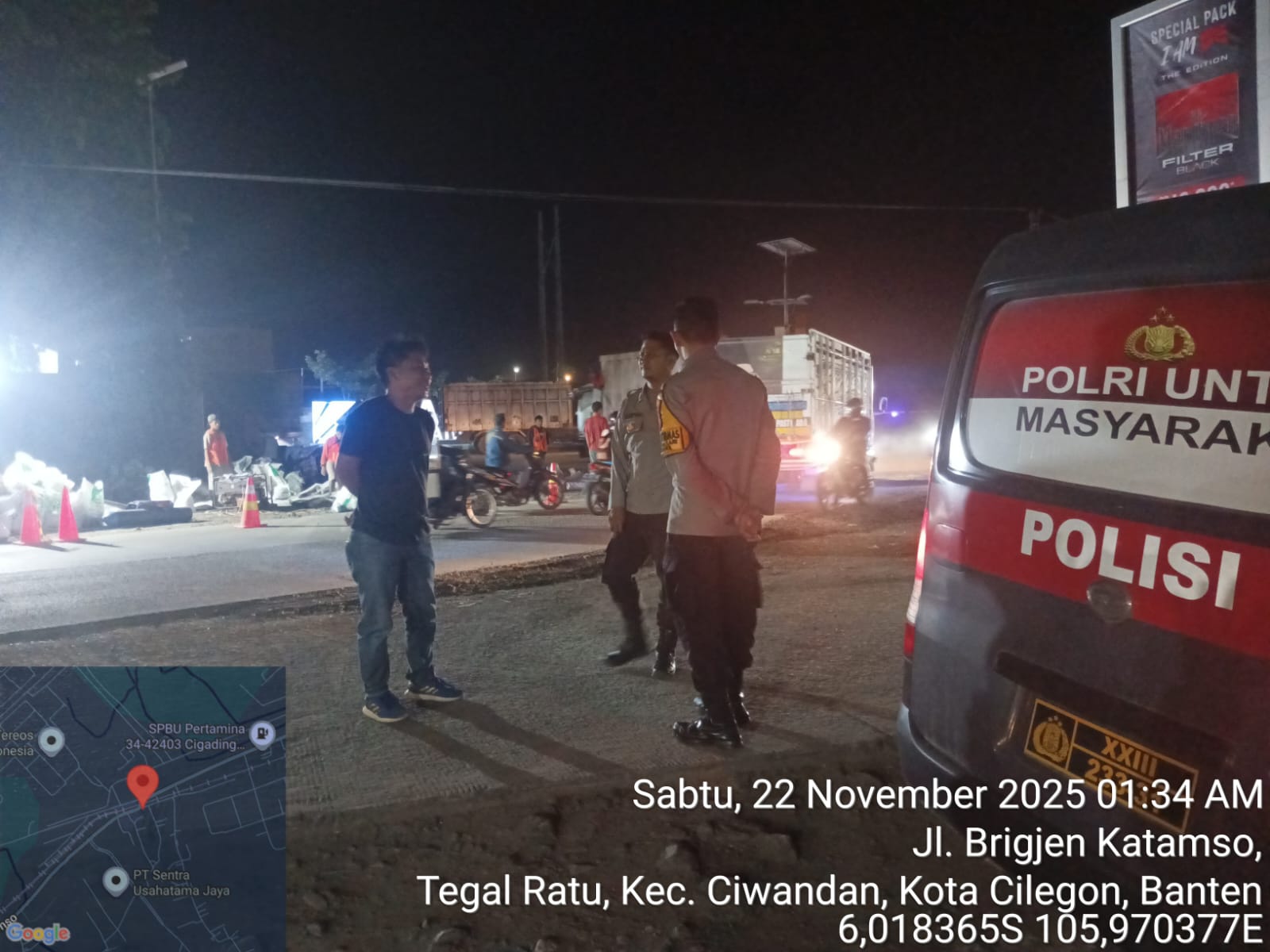Cilegon - Personil Polsek Ciwandan Polres Cilegon Polda Banten Selalu Melaksanaan Kegiatan KRYD (Kegiatan Rutin Yang Ditingkatkan) Patroli Rutin malam hari di daerah hukum Polsek Ciwandan Guna Persempit Ruang Pelaku Tindak Kejahatan, Sabtu (22/11/2025).