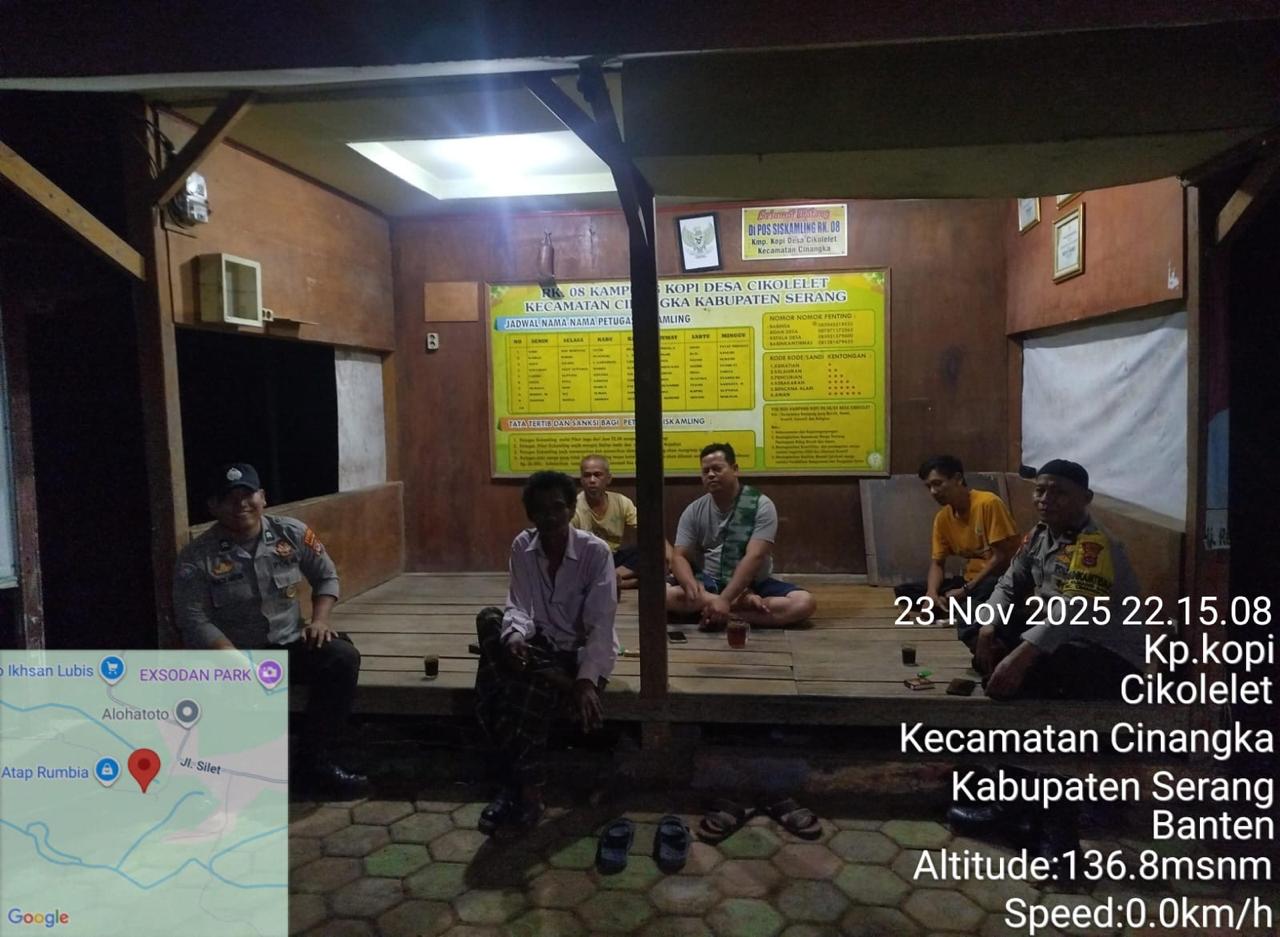 *Polres Cilegon* || Personil Bhabinkamtibmas Polsek Cinangka melaksanakan Program Komandan Wish Kapolda Banten RONDA SATKAMLING menyampaikan komunikasi dengan Petugas Siskamling agar berperan aktif dalam menciptakan Harkamtibmas yang aman dan Kondusif, Senin (24/11/2025).