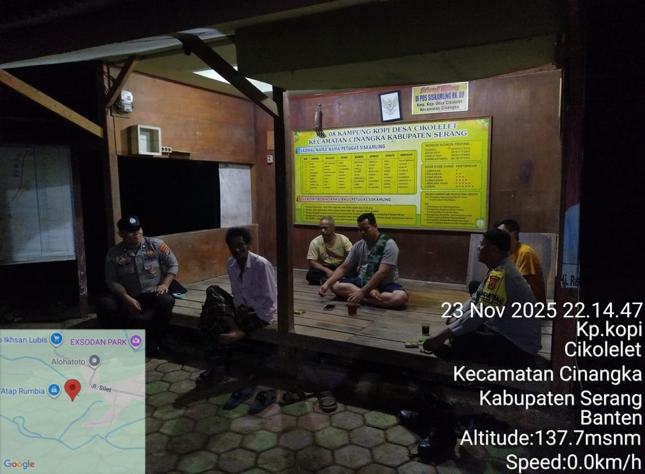 *Polres Cilegon* || Personil Bhabinkamtibmas Polsek Cinangka melaksanakan Program Komandan Wish Kapolda Banten RONDA SATKAMLING menyampaikan komunikasi dengan Petugas Siskamling agar berperan aktif dalam menciptakan Harkamtibmas yang aman dan Kondusif, Senin (24/11/2025).