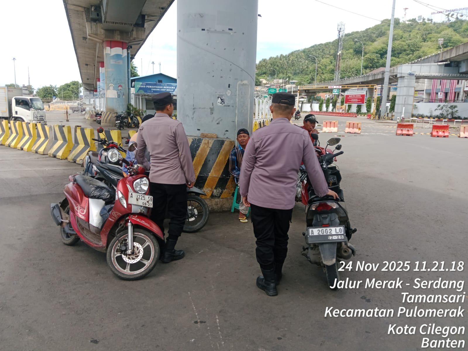 Cilegon - Personel Polsek Kskp Merak Polres Cilegon Polda Banten melaksanakan sambang dan patroli kawasan pelabuhan merak dalam rangka menjaga Harkamtibmas di Kawasan Pelabuhan Merak, Senin (24/11/2025).