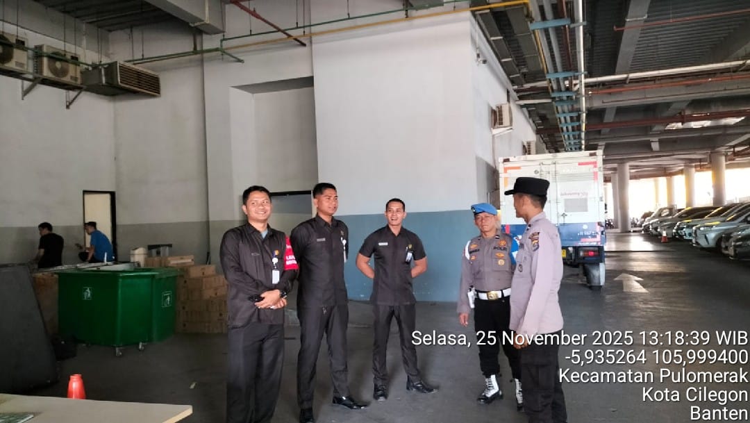 Cilegon - Personel Polsek Kskp Merak Polres Cilegon Polda Banten melaksanakan sambang dan patroli kawasan pelabuhan merak dalam rangka menjaga Harkamtibmas di Kawasan Pelabuhan Merak, Selasa (25/11/2025).