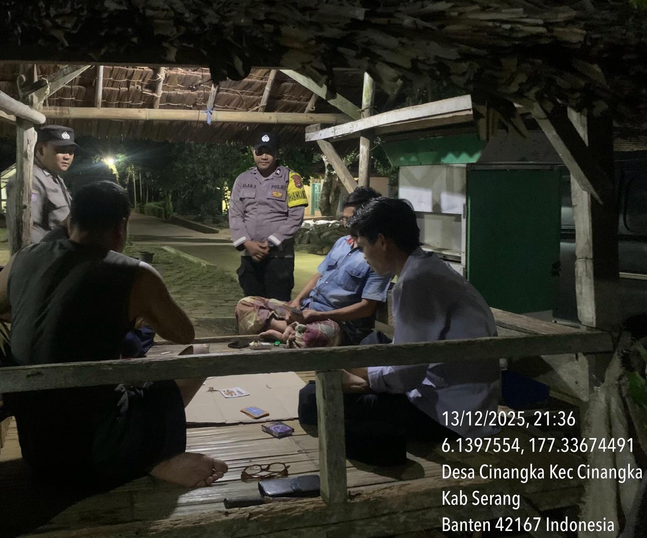 *Polres Cilegon* || Personil Bhabinkamtibmas Polsek Cinangka melaksanakan Program Komandan Wish Kapolda Banten RONDA SATKAMLING menyampaikan komunikasi dengan Petugas Siskamling agar berperan aktif dalam menciptakan Harkamtibmas yang aman dan Kondusif, Minggu (14/12/2025).