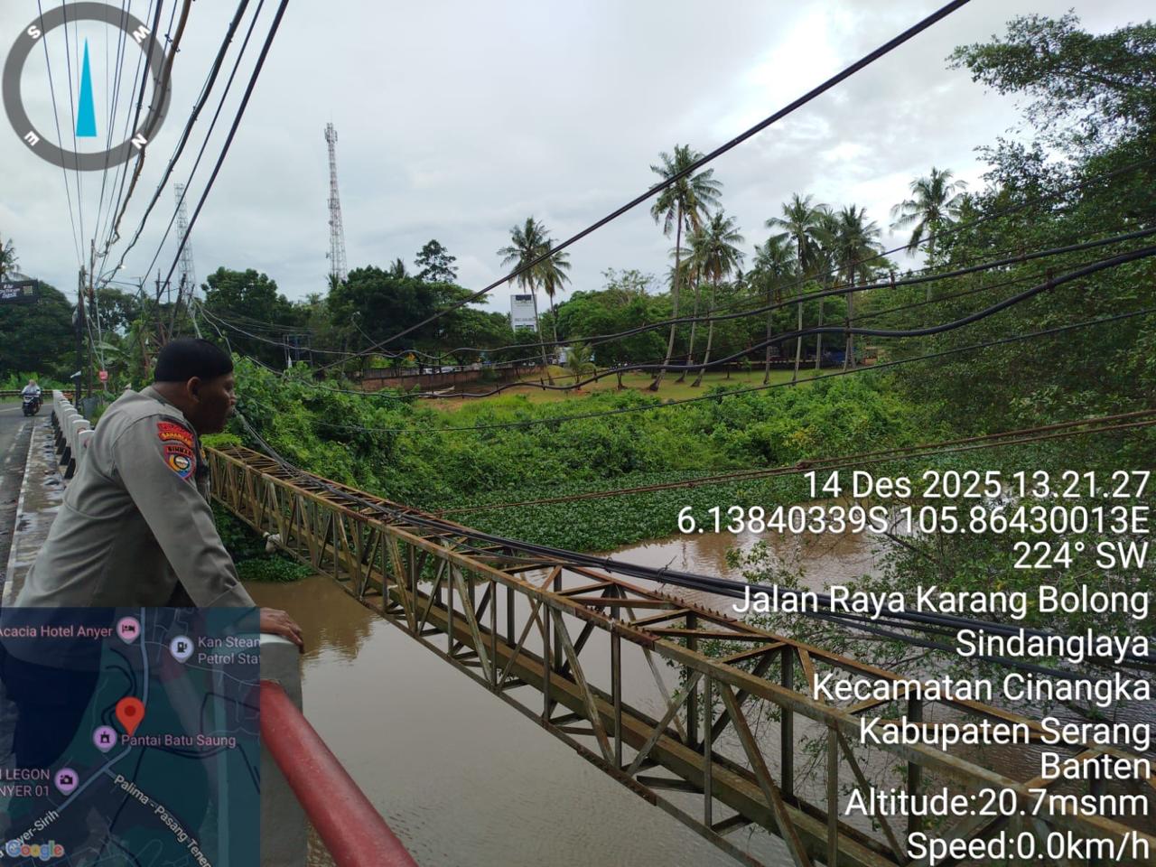 Piket Polsek Cinangka secara rutin melakukan pengecekan kondisi sungai dan berkoordinasi dengan pihak terkait untuk memantau perkembangan debit air. Pemantauan ini juga melibatkan partisipasi aktif dari masyarakat setempat.