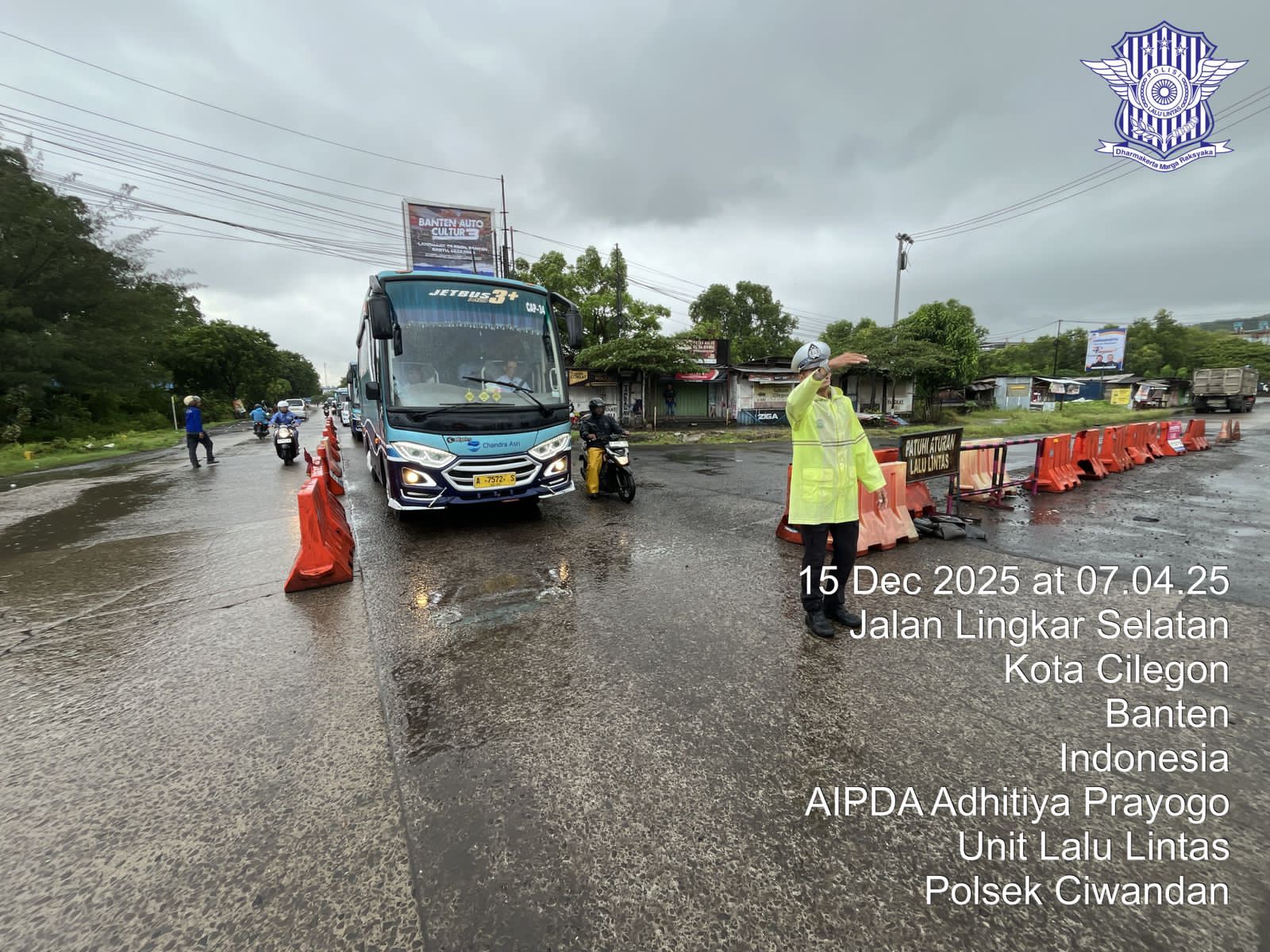 Cilegon - Unit Lalu-lintas Polsek Ciwandan Polres Cilegon Polda Banten Turunkan Personilnya melaksanakan pengaturan lalu lintas di Simpang JLS Ciwandan Pertigaan PT. Cemindo kelurahan Kepuh Kecamatan Ciwandan Kota Cilegon, Senin (15/12/2025).