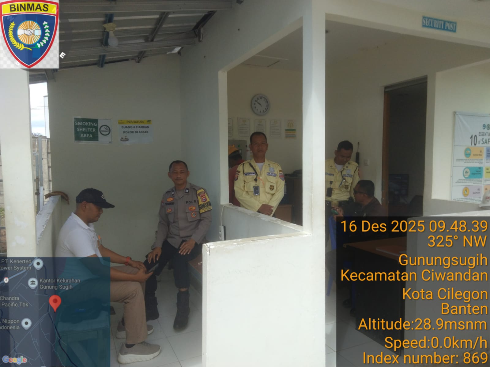 Bhabinkamtibmas polsek ciwandan menyambangi security/satpam perusahaan tersebut untuk berinteraksi dengan petugas keamanan yang bertugas. Ia berdiskusi dengan para satpam tentang situasi keamanan di sekitar perusahaan, berbagi informasi tentang potensi ancaman kejahatan, serta memberikan nasihat dan arahan terkait tindakan pencegahan dan keamanan yang dapat diambil.
