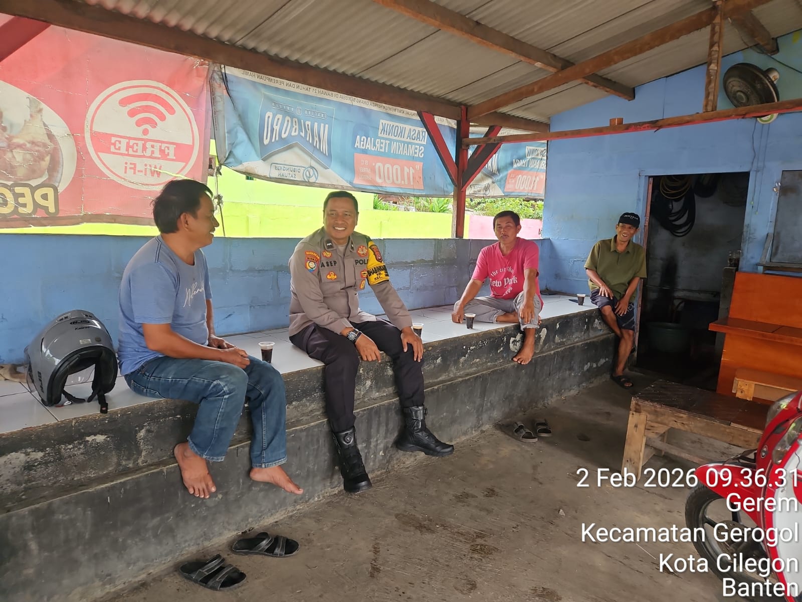 Cilegon - Polres Cilegon Polda Banten. Personil Bhabinkamtibmas Kelurahan Gerem Polsek Pulomerak AIPDA Asep Irmawan, Laksanakan Patroli dan Sambang Dialogis di Pangkalan Ojek Link. Kalibaru Rt.02/02 Kelurahan Gerem Kecamatan Gerogol Kota Cilegon. Senin (02/02/2026).
