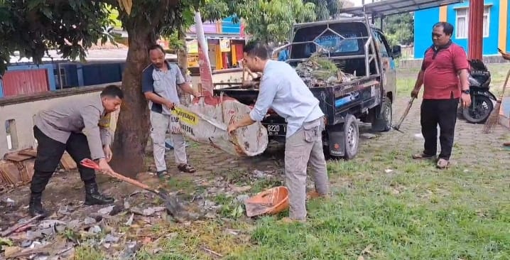 Dalam kegiatan tersebut, Bripka Agustoni bersama warga bergotong royong membersihkan sampah dan material yang berserakan di sekitar lingkungan serta mengangkutnya menggunakan kendaraan untuk dibuang ke tempat yang telah disediakan.